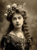 Dit portret toont een vrouw die fascineert met haar romantische uitstraling en gracieuze charisma. Haar kapsel is vakkundig verzorgd, met de volumineuze golven van haar haar perfect in scène gezet. De bloemen die in haar haar zijn geweven benadrukken het natuurlijke, bijna poëtische karakter van de foto. Vooral de rozen, symbool van…