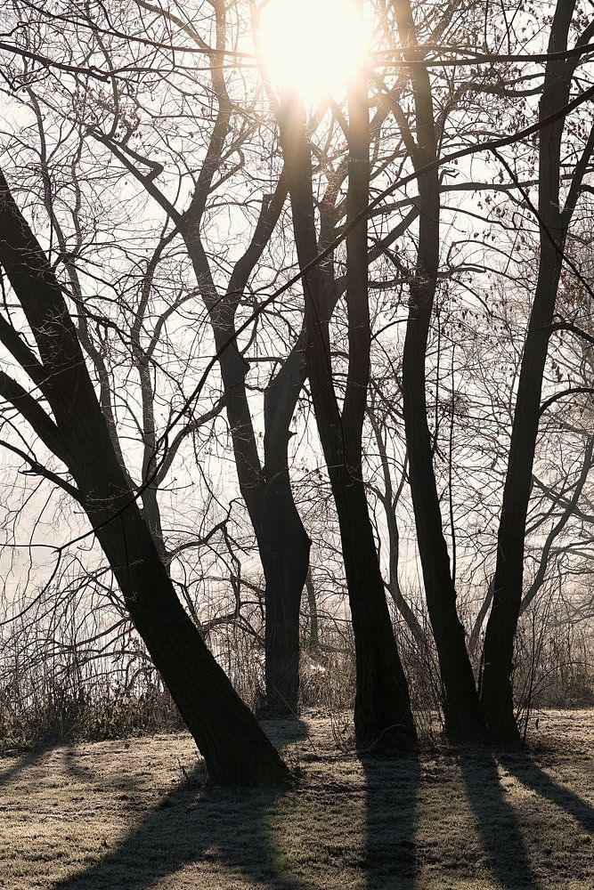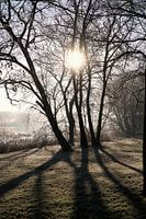 Romantische sfeer na zonsopgang in het Rotehornpark aan de oever van de Alte Elbe in Maagdenburg