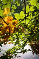 Kleurrijke herfst bladeren drijvend op het water. Aantrekkelijk uitzicht door de bomen en de weerspiegeling van het water, meer, kanaal, in het bos. Najaar-licht kleurt de takken met bladeren in diepe kleuren
