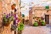 Romantische straat met mooie bloemen in Valldemossa dorp, Mallorca Spanje