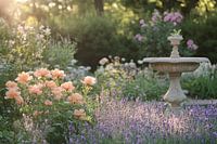 Deze prachtige tuin straalt een serene sfeer uit, met zachte kleuren en een elegante fontein die het middelpunt vormt. De perzikkleurige bloemen en lavendel bloeien vol en verspreiden een rustige, warme uitstraling, perfect voor iedereen die van een klassieke en rustgevende tuin houdt. Het ochtendlicht dat door de bloemen schijnt, geeft een magisch gevoel van rust en harmonie. Ideaal als inspiratie voor je eigen tuinontwerp of als decoratief beeld in je interieur om een vleugje natuur naar binnen te brengen. Dit beeld vangt de essentie van een klassieke Engelse tuin, waar de kleuren en texturen elkaar perfect aanvullen.