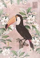 tropische toekan met exotische installaties en bloemen op uitstekende achtergrond
