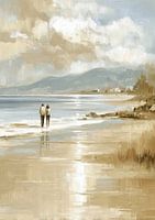 Een sfeervol olieverfschilderij toont twee mensen die hand in hand langs het strand lopen. De scène is geschilderd in zachte beige en grijze tinten, met zachte, gedetailleerde penseelstreken en weerspiegelingen op het water. Het uitzicht in de verte toont een kalme zee en bergen in de verte, terwijl de zachte zeebries de vredige sfeer…