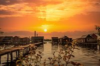 De foto toont deze huizen in de ondergaande zon, de pieren of steigers moeten het beeld inleiden. de kleuren en de unieke avondsfeer maken het totaalplaatje compleet. Ik ging speciaal naar deze plek in de avonduren om deze sfeer precies zo vast te leggen.