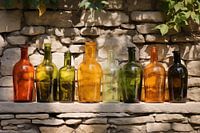 Foto van een rij antiek renaissance flessen op een muur in een zonnige Florentijnse tuin. Klassieke organische vormen in mooie natuurlijke amber-, bruin en groentinten creëren een nostalgische sfeer van sereniteit en harmonie.