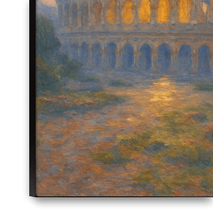 Dit fascinerende kunstwerk toont het legendarische Colosseum dat oprijst uit de zachte nevel van de dageraad, verlicht door warm, gouden licht dat door de eeuwenoude bogen sijpelt. De zachte, impressionistische penseelvoering geeft het tafereel een serene sfeer en transformeert een van 's werelds meest iconische monumenten in een…