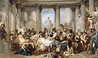 In het midden van het schilderij heeft Couture een groep losbandige feestvierders, uitgeput en gedesillusioneerd of nog steeds drinkend en dansend, geplaatst. Op de voorgrond staan drie mannen die niet deelnemen aan de dronken zwelgpartijen: links een melancholische jongen die op een zuil zit en rechts twee buitenlandse bezoekers die een afkeurend oogje op het tafereel werpen. Ook de antieke beelden die boven de groep opdoemen, lijken de orgie te veroordelen.