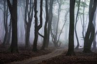 Een kronkelende weg langs de dansende bomen in een mistig bos