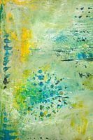 Around the World II - Een levendige mix van blauw, groen en geel creëert een energiek en abstract werk. Verschillende penseelstreken, spatten en texturen suggereren een dynamische en expressieve stijl.