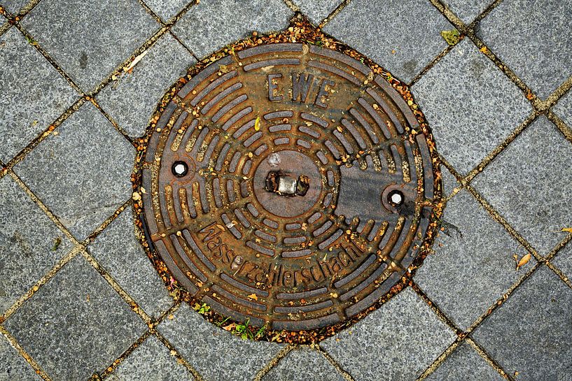 Watermeterput met het opschrift Wasserzählerschacht. De typografie, het concentrische patroon en de sporen van gebruik geven dit alledaagse, roestige object een eigen karakter.