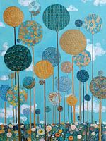 Ronde Bomen | Whimsical Tree Circles in Blue - Dit kleurrijke schilderij toont een patroon van grote, ronde bomen in diverse tinten zoals turqouise, goud en groen, die zich aftekenen tegen een heldere blauwe lucht, waardoor een vrolijke, moderne sfeer ontstaat in dit biophilic schilderij.