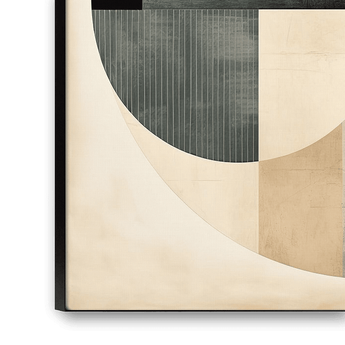 Ronde Vormen en Lijnen - Dit is een abstract schilderij met grote, ronde vormen in zwart, grijs en oranje, die samen een moderne compositie vormen.
