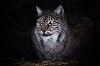 Ronde ironische blik grote kattenlynx in het donker, krachtig beest.
