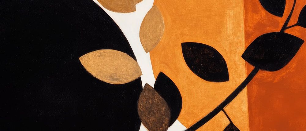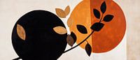 Dynamische kleuren en harmonieuze vormen komen samen in dit kunstwerk met levendige contrasten tussen diepzwart en warme aardetinten. De gestileerde bladeren en cirkels geven de kamer een modern tintje. Ideaal voor de woonkamer, waar het een gesprek stimuleert en een uitnodigende sfeer creëert.