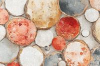 Een verzameling ronde vormen vult het vlak, variërend in kleur van warm rood en oranje tot koel grijs en zacht wit. De cirkels overlappen elkaar subtiel, waardoor een speels maar evenwichtig geheel ontstaat.