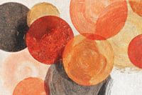 In dit werk zweven ronde vormen in rijke tinten oranje, rood, zwart en goud over een lichte achtergrond. De cirkels overlappen elkaar deels, waardoor lagen en diepte ontstaan. Sommige tonen zachte kleurnuances, andere hebben een krachtigere, bijna gloedvolle uitstraling.