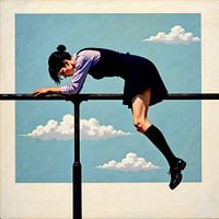 "Hanging Around" is een visuele verkenning van introspectie en de delicate balans tussen stabiliteit en overgave. De centrale figuur, leunend over een horizontale balk tegen een achtergrond van rustige wolken, belichaamt het gewicht van contemplatie. Haar houding, geaard en toch zwevend, nodigt kijkers uit om na te denken over momenten waarop het leven een pauze inlast, alsof ze gevangen zit tussen voorwaartse beweging en stilte.