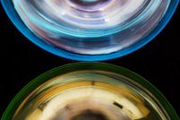 Ik zette twee glazen gevuld met water tegen elkaar. Een glas had een groene kleur, de andere blauw. De camera plaatste ik er recht boven, op een statief. Ik stelde een groot diafragma in, zodat alleen de randen van de glazen scherp zouden blijven. Hierdoor ontstonden mooie cirkels in het spiegelende water. Ik wilde een abstract werk…