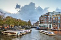 Prachtige opname van de rondvaartboten in de Amstel bij het muntplein in Amsterdam, Nederland, met een dreigende wolkenlucht