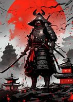 Op het portret staat een samoerai gekleed in een ingewikkeld, glanzend harnas dat getuigt van fijn vakmanschap en aandacht voor detail. Hij houdt een gepolijste katana vast, waarvan het lemmet de warme tinten van een prachtig Japans landschap achter hem weerspiegelt. Kersenbloesems en traditionele motieven versterken de scène en belichamen de geest van eer en plicht.
