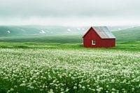 In het midden van een bloeiende weide met tere, witte bloemen rijst een felrood huisje op, pulserend als een levendig hart in het zachte, groene landschap. De grijze lucht omhult het tafereel met een mystiek aura, terwijl de natuur lijkt te zweven in rustige harmonie. Een stille plek vol vrede en contemplatie.