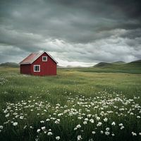 Midden in een zee van bloeiende bloemen troont een felrood huisje, dat doet denken aan de kracht van de natuur. Donkere, dreigende wolken drijven voorbij in de lucht en geven het landschap een mysterieuze sfeer. Hier, waar het plattelandsleven en het onvoorspelbare weer elkaar ontmoeten, vertelt het landschap over stille momenten en de…