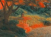 Tijdens mijn reis van de zomer in Portugal waren we in een hotel in Coimbra. Er was in de tuin een Japanse tuin aangelegd met daarin een rood huisje. en een witte lantaarn. Ik heb de foto bewerkt met fotoshop in een impressionistische stijl met herfstkleuren waardoor het een warme schilderachtige uitstraling heeft