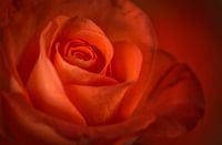 Close-up foto van een prachtige volle oranje-rode roos in warm licht gefotografeerd met het hart op de juiste plaats.