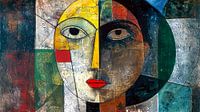 Het schilderij toont een abstract portret van een vrouw in de stijl van het kubisme met grote ogen en rode lippen, aangevuld met surrealistische elementen, een kleurrijke achtergrond en gevarieerde geometrische vormen vanuit meerdere perspectieven. Olieverf op canvas wordt gebruikt om intense kleuren en texturen te creëren en diepte aan het kunstwerk toe te voegen.