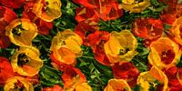 In het voorjaar knallen de kleurige tulpen in de verder nog wat saaie tuin. Tulpen in geel en rood met daartussen het frisse groene blad. Foto is gemaakt met dubbele belichting om het feest van de kleur nog eens te benadrukken.