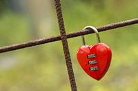 Rood hangslot in de vorm van een hart aan een verroeste betongaas constructie.