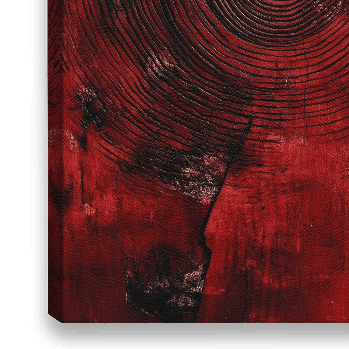 Dit krachtige kunstwerk legt de nadruk op de natuurlijke concentrische lijnen van houtnerven, omlijst door een intense rode achtergrond. De zwarte details en texturen versterken het contrast, waardoor de nerven een hypnotiserend en dynamisch effect creëren. De verweerde accenten voegen een rauwe, aardse esthetiek toe die de tijdloosheid…