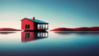 Een huis staat op het water bij een rustig meer, minimalistisch, surrealistisch, helder cyaan en rood.