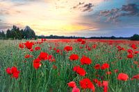 Veld met klaprozen. Rode bloemen met groene bladeren. Vroege zomerbloemen.