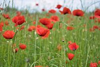 Veld met klaprozen. Rode bloemen met groene bladeren. Vroege zomerbloemen.