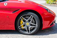 Voorkant en wiel met gele remmen van een rode Ferrari.