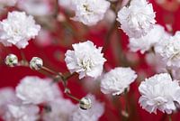 "Rood met witte bloemetjes" is een macrofoto van kleine witte bloemetjes met een (bordeaux) rode achtergrond.