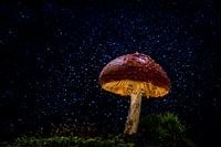 Een waar kunstwerkje en een lust voor het oog. Een fragiel paddenstoeltjes die als een lantaarn schijnt over een mos landschap. Een echte rood met witte stippen zwam. De bloeiwijze van het mos is goed te zien en de water druppels geven deze foto een mystiek en mistig gevoel. De regen druppels glinsteren in de donkerblauwe nachtelijke hemel. Het voelt als een sprookje. Hoe kan dit paddestoeltje licht geven. Met behulp van een zaklamp, flitsers en een plantenspuit is dit bijzondere beeld gemaakt. Het is letterlijk met licht geschreven. Prachtig voor een kinderkamer maar voor op kantoor of woonkamer ook een uitzonderlijk mooi en bijzondere print.