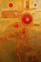 Dit werk combineert rijke, gouden tinten met opvallende rode cirkels, waardoor een krachtig visueel contrast ontstaat. De centrale rode cirkel trekt onmiddellijk de aandacht en straalt energie uit, terwijl de omliggende rode accenten het oog door de compositie leiden. De achtergrond heeft een warme, gouden gloed die een gevoel van luxe en warmte oproept. Dit werk past perfect in een eigentijdse ruimte, zoals een moderne woonkamer of een stijlvolle kantoorruimte, waar het een focuspunt kan zijn dat zowel kracht als elegantie uitstraalt.