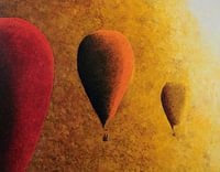 Speels schilderij met warme kleuren. Heteluchtballonnen in een gouden zon.
