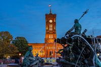 Neptunusfontein en het stadhuis Rotes Rathaus in de schemering, Berlijn, Duitsland | Neptunusfontein en het stadhuis Rotes Rathaus in de schemering, Berlijn, Duitsland