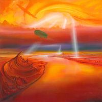 Het schilderij met het motief van een "rode baan" toont een fascinerend en surrealistisch tafereel. Het felle rood van de omgeving geeft de voorstelling een sterke emotionele aanwezigheid en zou kunnen duiden op passie, energie en intensiteit. De "rode baan" zelf, waarop de groene zeppelin drijft, kan worden geïnterpreteerd als een…