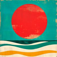 Een helderrode bol zonlicht zweeft majestueus boven een zachte, harmonieuze oceaan van gebogen lijnen. De koele, turquoise achtergrondkleur bevordert een gevoel van ruimte, terwijl de zachte golven in rustgevende blauw- en geeltinten de gratie van de natuur weerspiegelen. Deze afbeelding straalt een unieke, minimalistische schoonheid…