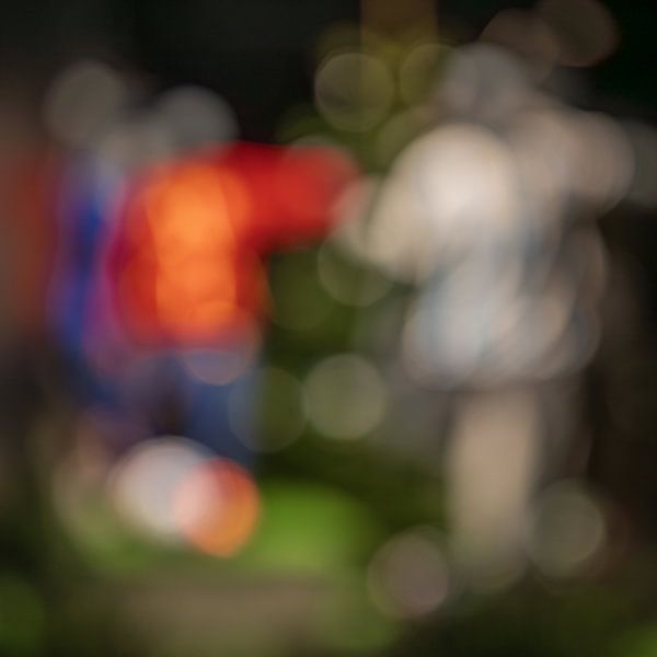 Voetbalspelers trappen in het donker een balletje...Bij het maken van de foto is de out of focus techniek gebruikt waardoor een onscherp maar suggestief beeld is ontstaan dat een beroep doet op enige fantasie...