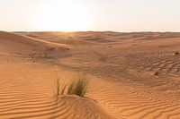 De prachtige zonsondergang in de woestijn van Dubai, verenigde Arabische Emiraten, waar het zand rood kleurt vlak voordat het donker wordt.