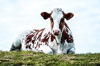 Liggende beeldvullende roodbonte koe in Nederland ligt rustig te herkauwen op de dijk.