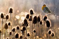 Roodborst (Erithacus rubecula) zittend op kaardebollen met tegenlicht.