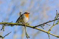 Roodborst, Erithacus rubecula op een tak tegen een blauwe lucht in de winter in het Larserbos van Stichting Flevolandschap, Lelystad, Flevoland, Nederland