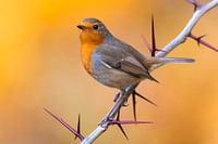 Prachtige Roodborst (Erithacus rubecula) zittend op fraai gevormde tak met stekels tegen een oranje gekleurde achtergrond.