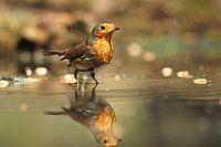 Roodborst met zijn spiegelbeeld. Op een van de eerste warmere dagen van het voorjaar kwam deze een lekker bad nemen. De roodborst of het roodborstje (Erithacus rubecula) is een zangvogel uit de familie Muscicapidae (vliegenvangers). Hij waagt zich dicht bij huizen, vooral 's winters. Verder is het een zeer talrijke broedvogel van grote…